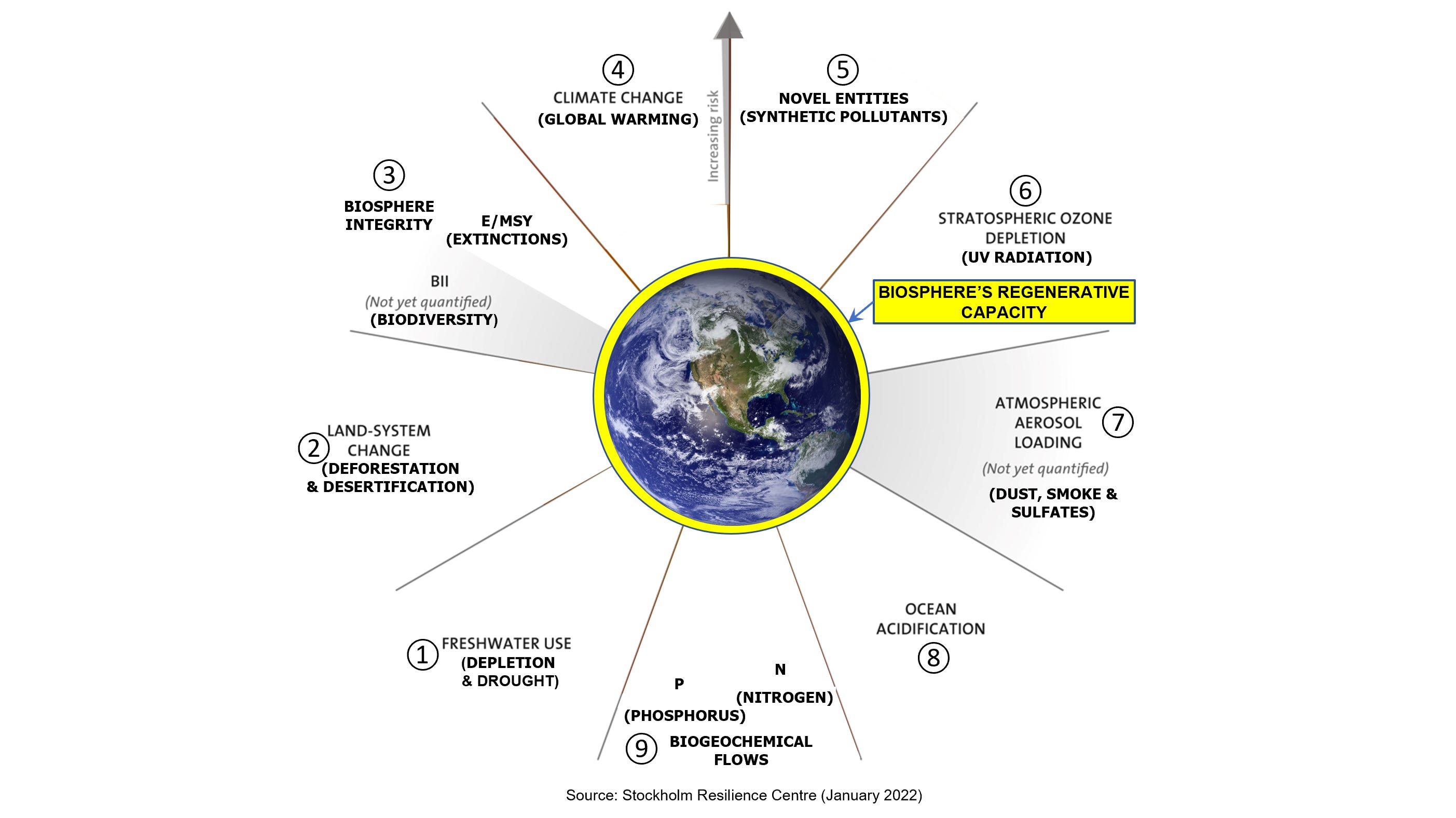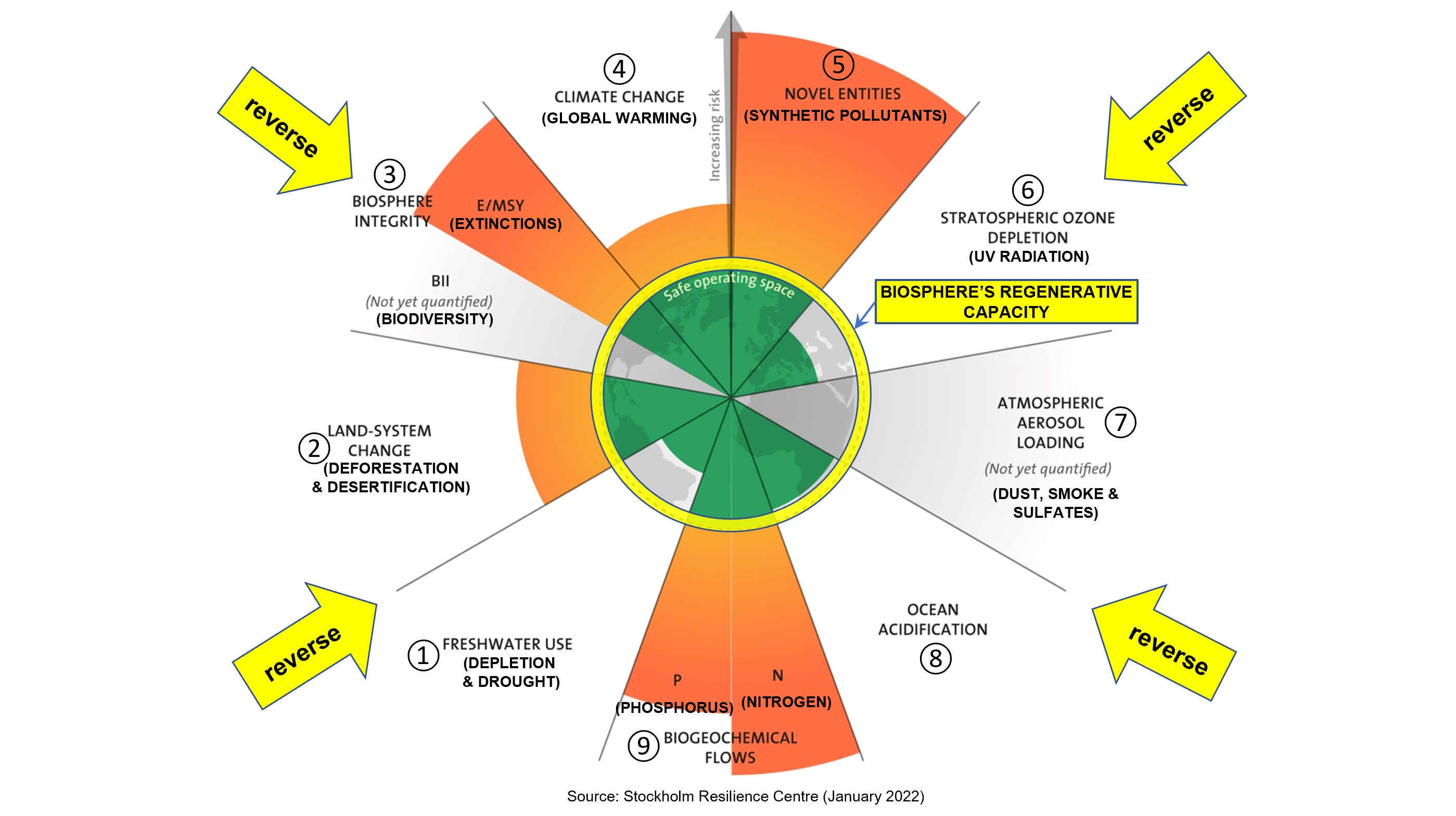 … this damage to the biosphere is showing up as the sum of nine planet-scale ecological crises (the “Ecological Crisis”) created by humanity’s “overshoot” of “planetary boundaries” …