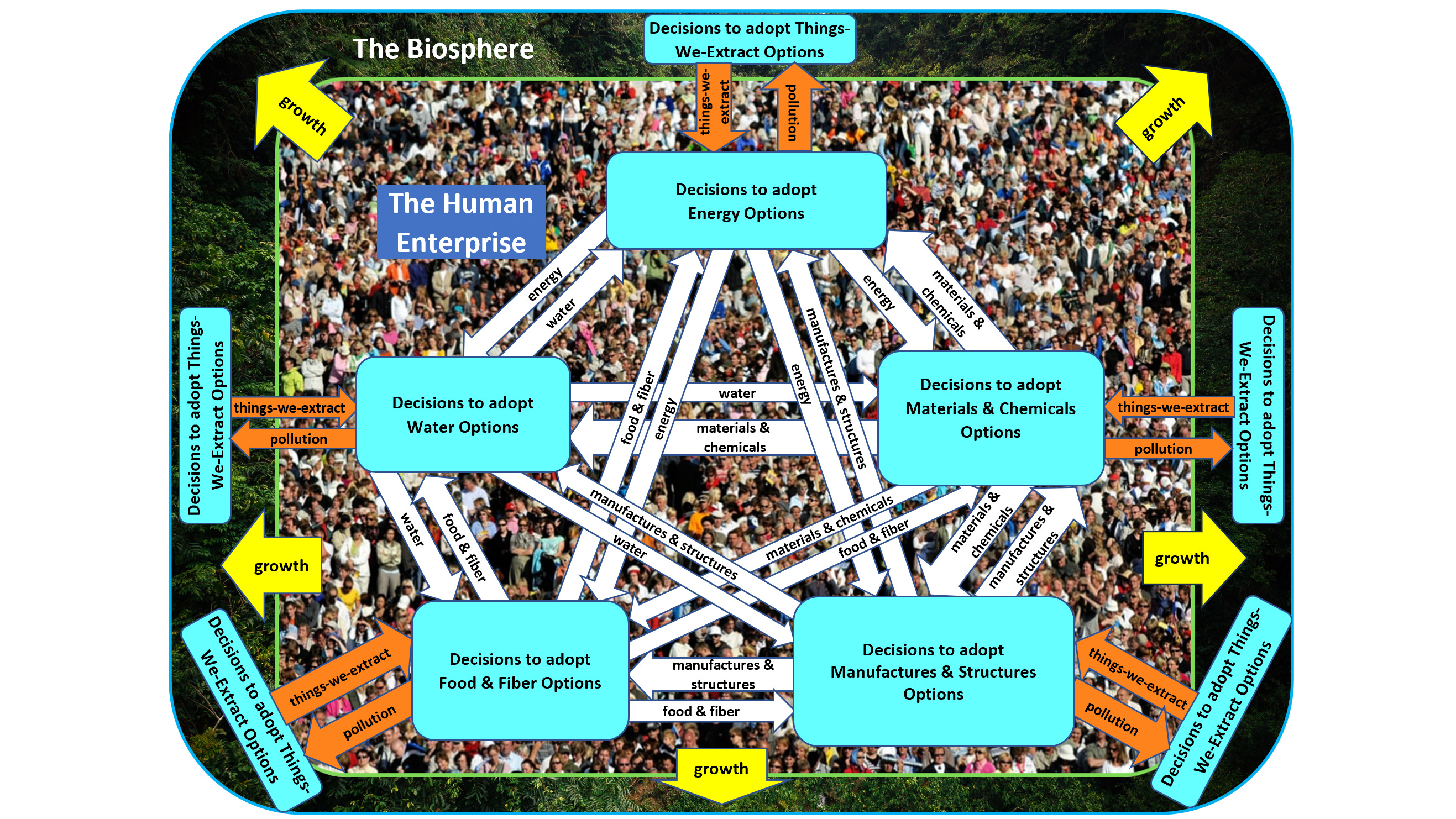 … human decision-making for meeting human physical needs (in turquoise) is creating exponentially-growing things-we-extract flows[5] and pollution flows[6] (in orange) that are damaging the biosphere’s capacity (in deep green) for meeting the physical needs of all living beings, including human beings, and …