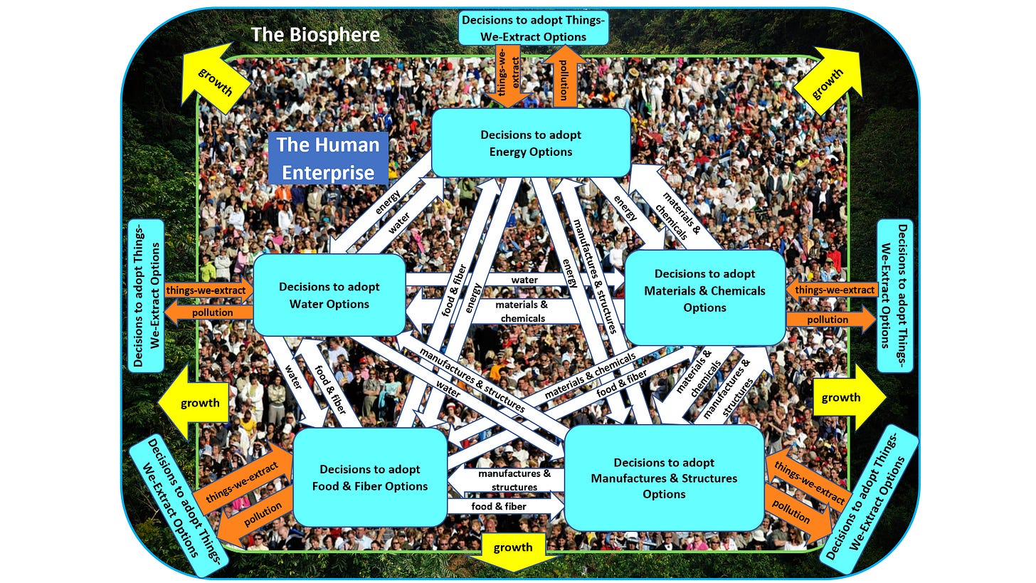 … people everywhere make specific decisions and take specific actions for meeting their human physical needs (in turquoise) that scale back the things-we-extract flows and pollution flows (in orange) …