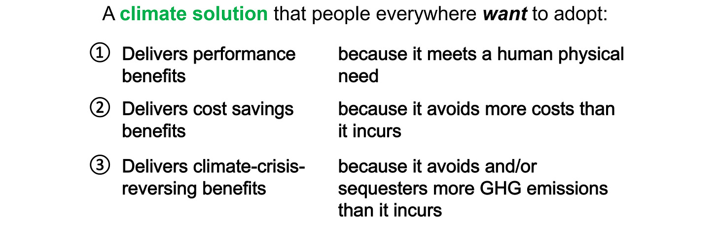 the climate solution delivers performance benefits because it meets a human physical need (for things like energy, water, food, materials & manufactures),