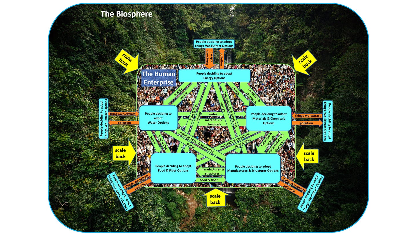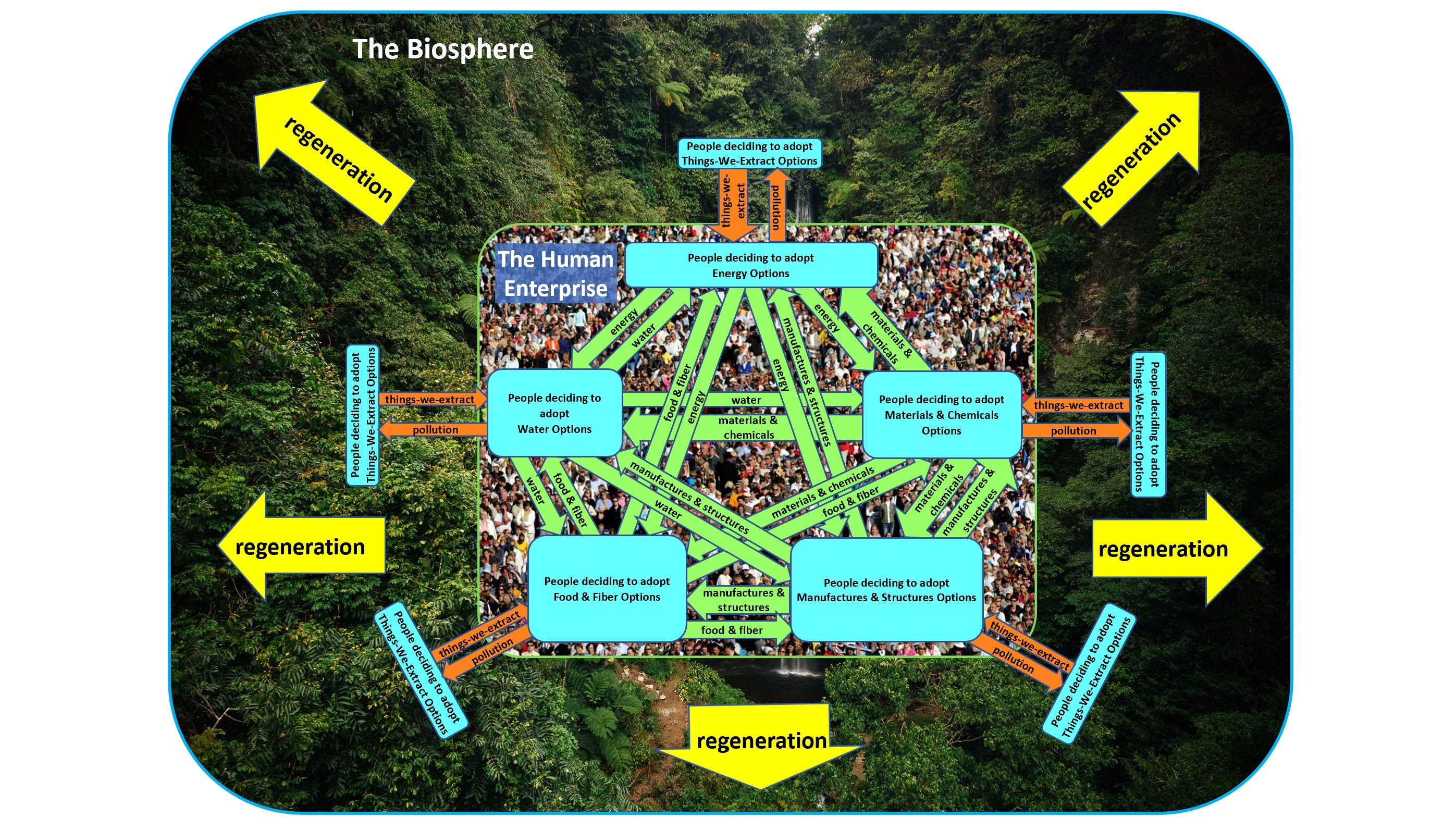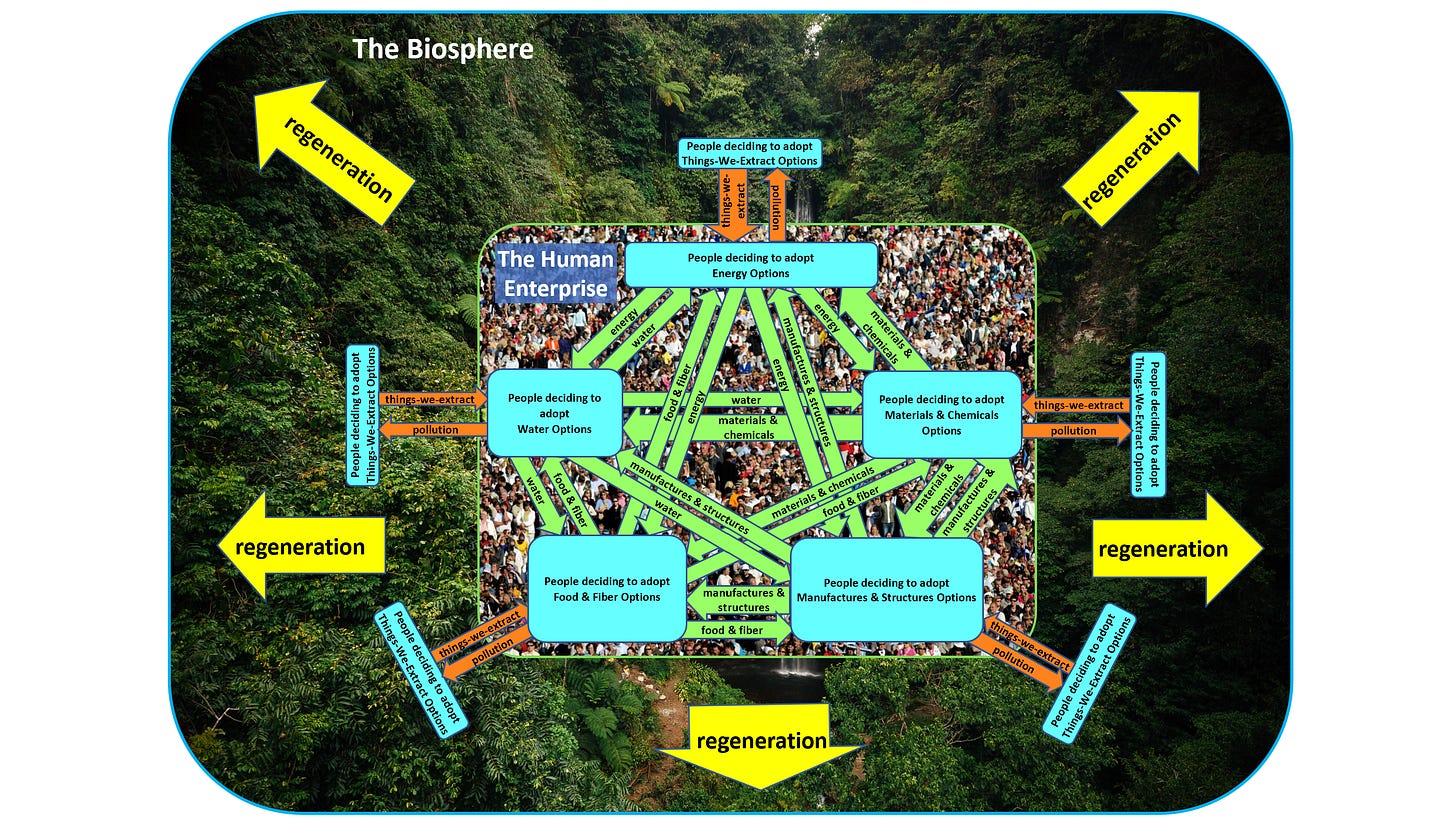 People everywhere making decisions for meeting human physical needs (in turquoise) are creating exponentially growing things-we-extract flows and pollution flows (in orange) that are damaging the biosphere (in deep green) faster than the biosphere can regenerate itself …