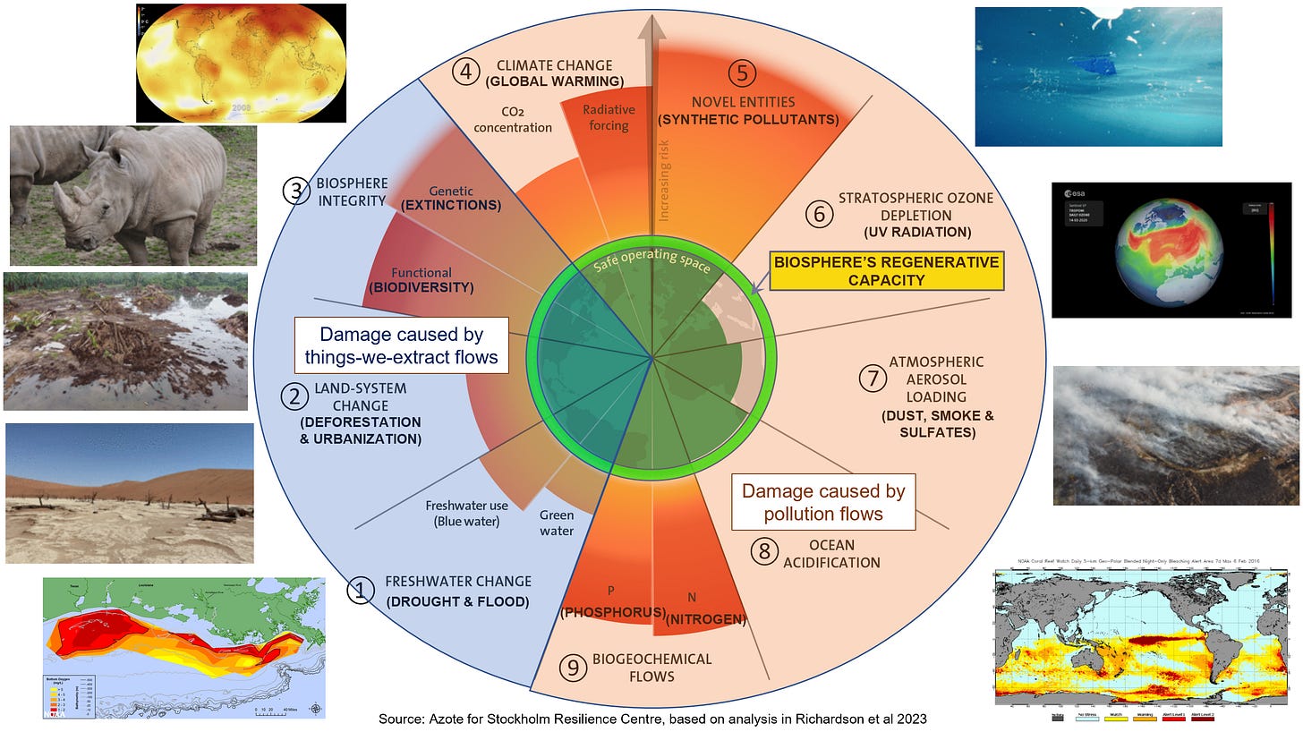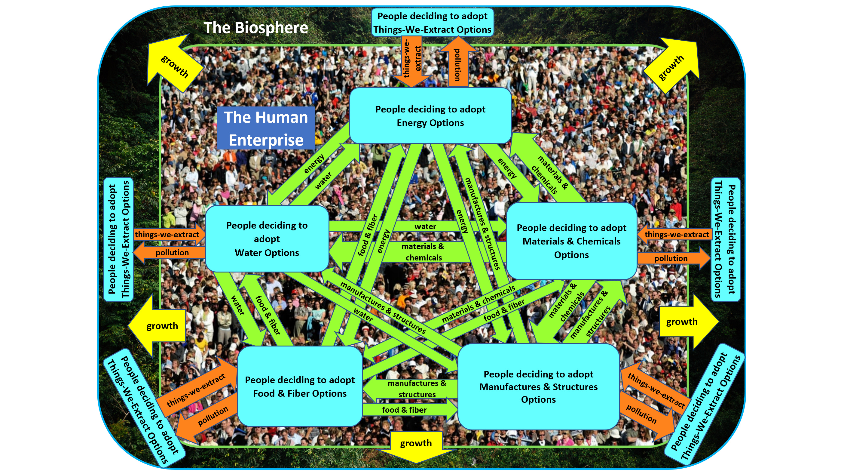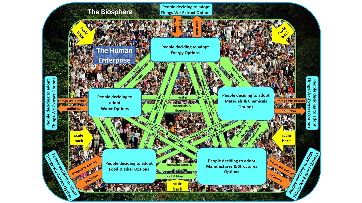 People everywhere making decisions for meeting human physical needs (in turquoise) are creating exponentially growing things-we-extract flows and pollution flows (in orange) that are damaging the biosphere (in deep green) faster than the biosphere can regenerate itself …