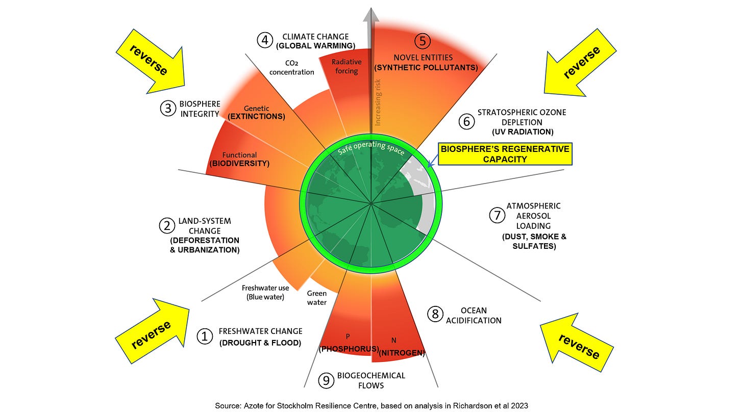 … and allows the biosphere’s regenerative capacity (in bright green) to reverse (in yellow) the ecological crises (in orange) as a whole …