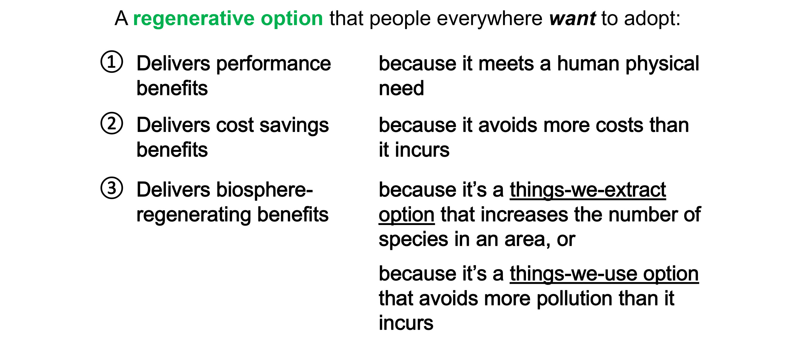 … and deciding to adopt “regenerative options” (including climate solutions) that deliver performance benefits, cost savings benefits and biosphere-regenerating benefits …