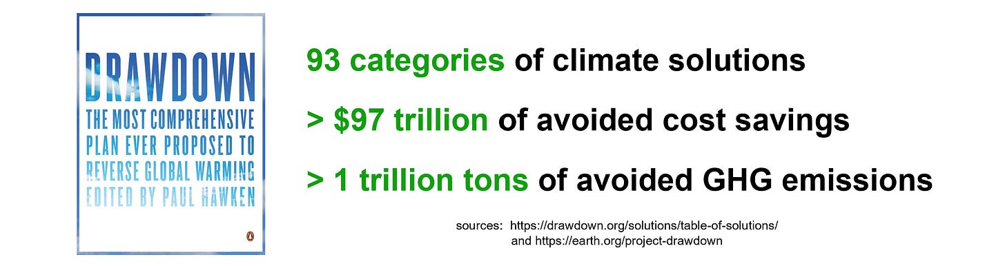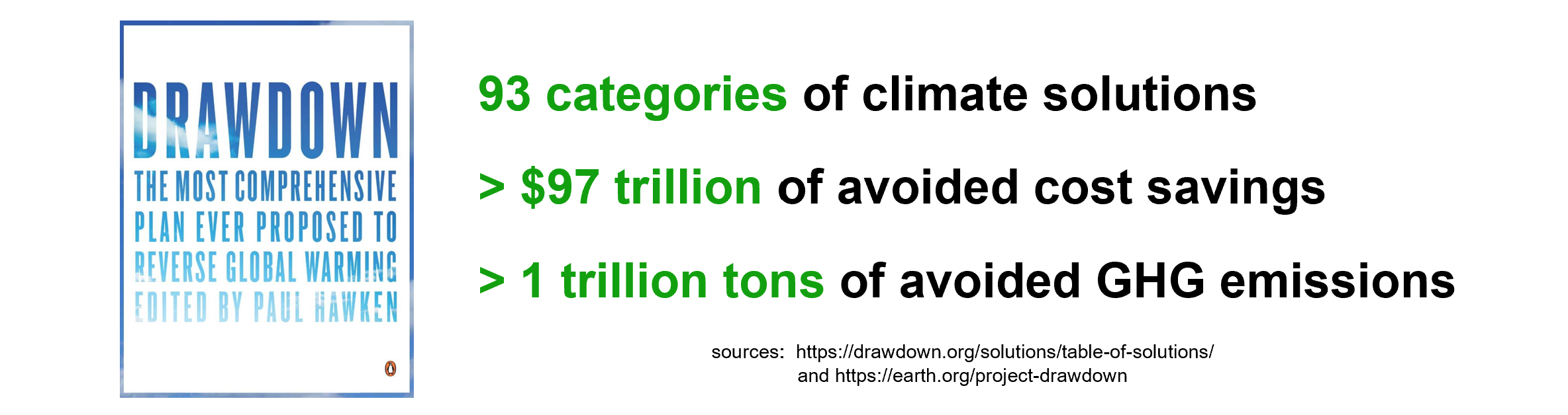 Drawdown estimated those 93 categories of climate solutions – when widely adopted -- to deliver more than $97 trillion of avoided cost savings (cost savings benefits) and more than 1 trillion tons of avoided and/or sequestered greenhouse gas emissions (climate-crisis-reversing benefits) …