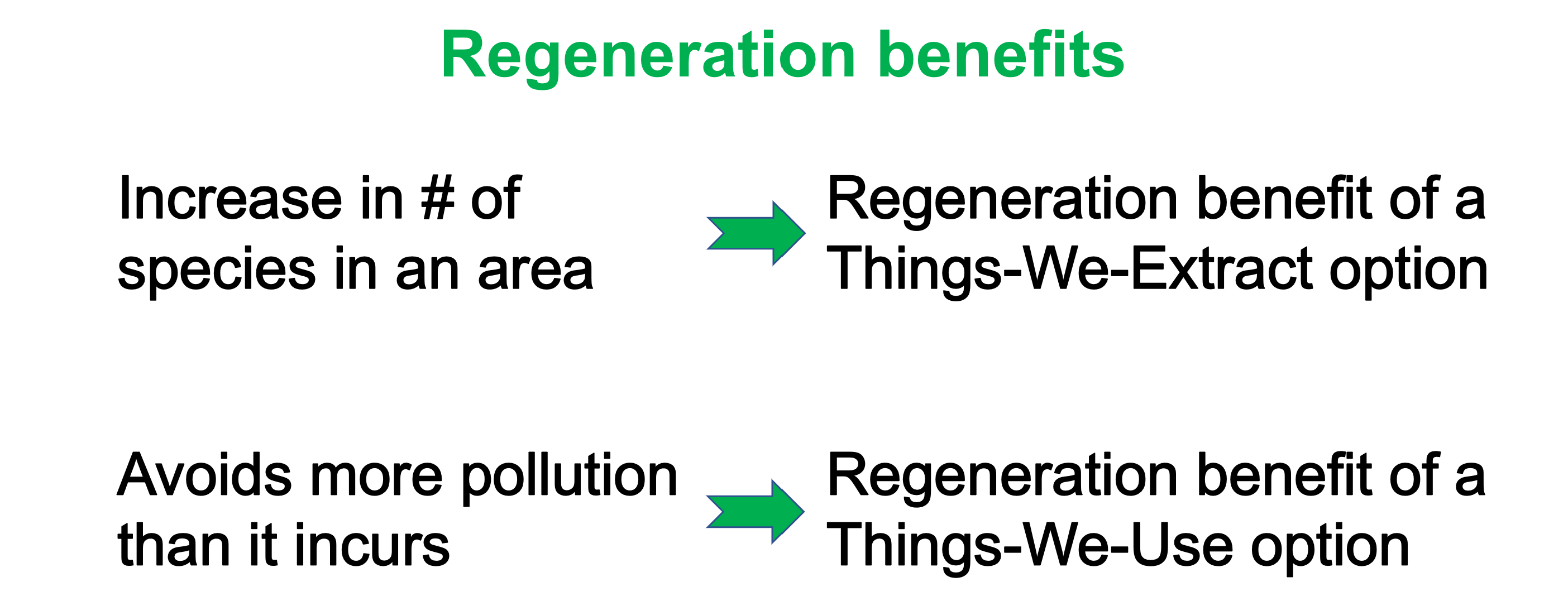 That lessened extraction – measured by an increase in the number of species in an area – may be called a “regeneration benefit” of a Things-We-Extract option.