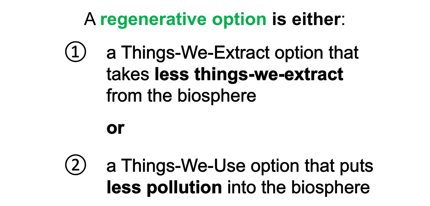 A Things-We-Extract option or a Things-We-Use option that scales back the extraction flows and/or pollution flows may be called a “regenerative option” because scaling back the extraction flows & pollution flows allows the planet’s biosphere to regenerate itself.