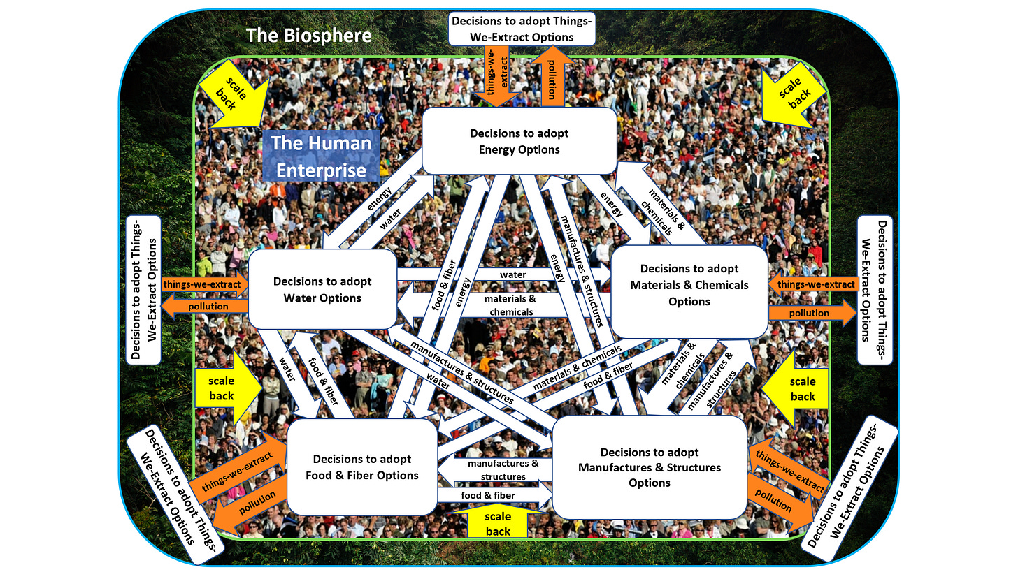 … reversing the planet’s ecological crises requires a simple & practical Human Enterprise decision-making process for adopting Things-We-Extract options and Things-We-Use options that scale back (or “de-grow”) the extraction flows and pollution flows of the Human Enterprise that are creating the planet’s eco-crises …